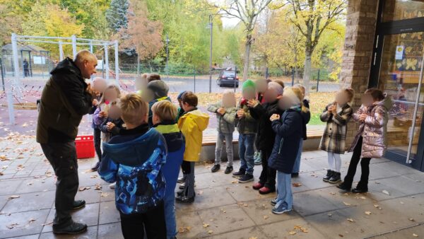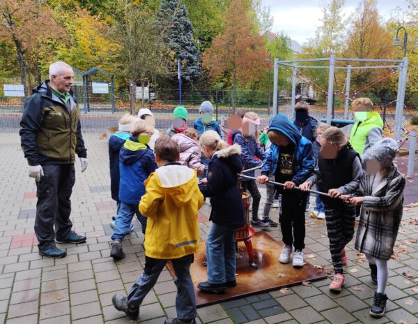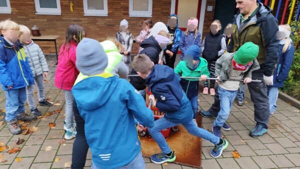 Heute stand für die Klassen 1 und 2 ein ganz besonderes Erlebnis auf dem Stundenplan: Apfelpressen mit dem Rhönranger Herrn Walter! Zuerst durften wir Herrn Walter und seine mitgebrachten Geräte kennenlernen.