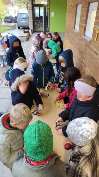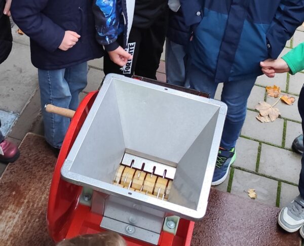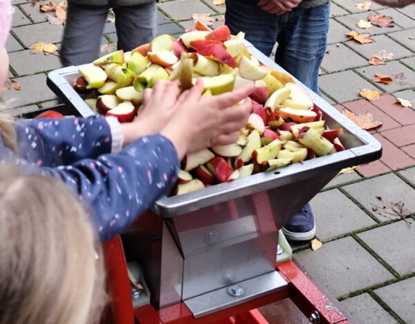 Dann erklärte uns Herr Walter genau, wie das Apfelpressen funktioniert. Zuerst müssen die Äpfel gewaschen und geteilt werden. Danach werden sie mit einem großen Schneider zerkleinert, bevor sie in die Presse kommen. Mit großer Begeisterung machten sich alle Kinder ans Werk: Es wurden viele Äpfel gewaschen, geteilt und anschließend mit dem großen Schneider zerkleinert – ganz schön anstrengend, aber auch spannend!