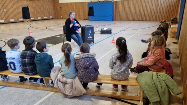 Die Trainerin des ADAC, Frau Heiß, führte mit ihrer Handpuppe, dem Raben ADACUS, die Kinder der ersten Klasse spielerisch an ihre Rolle als Fußgänger im Straßenverkehr heran.