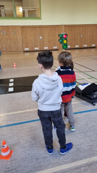 Mit einem Gedicht samt Handbewegungen wurden bereits zu Beginn die wichtigsten Regeln beim Überqueren einer Straße erlernt. Die Kinder berichteten, was sie schon alles über das richtige Verhalten wissen und lernten viel Neues dazu. Auch, welche Kleidung besonders in der dunkleren Jahreszeit gut für andere Verkehrsteilnehmer zu sehen ist, erfuhren die Schülerinnen und Schüler am praktischen Beispiel.